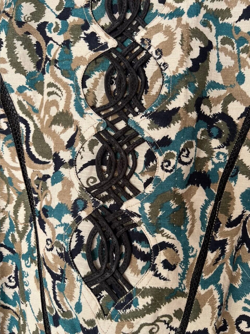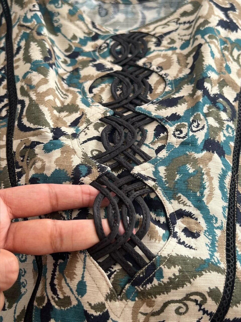 | Shirt | cries cross loops pattern with scalp them and diagonal center lace damn cut them of shirt and sleeves u shape with piping |